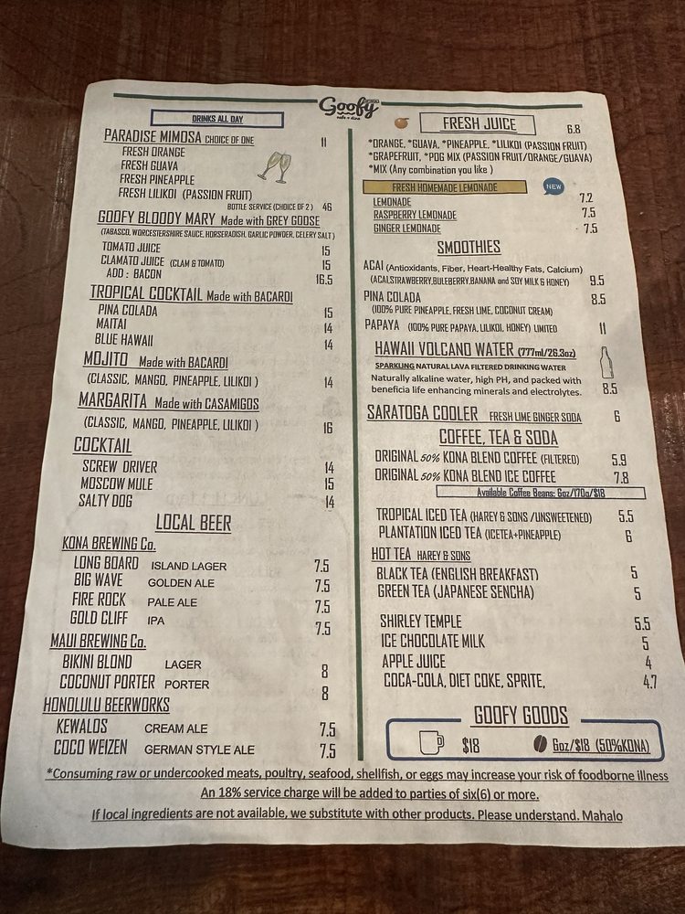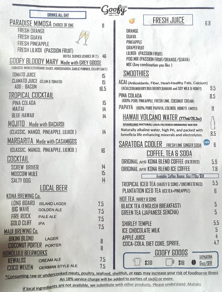 ORIGINAL % KONA BLEND COFFEE (FILTERED):$/ORIGINAL % KONA BLEND ICE COFFEE:$/TROPICAL ICED TEA (UNSWEETENED):$./PLANTATION ICED TEA (ICETEA+PINEAPPLE):$/ARNOLD P. ICED TEA(ICED TEA + LEMONADE):$